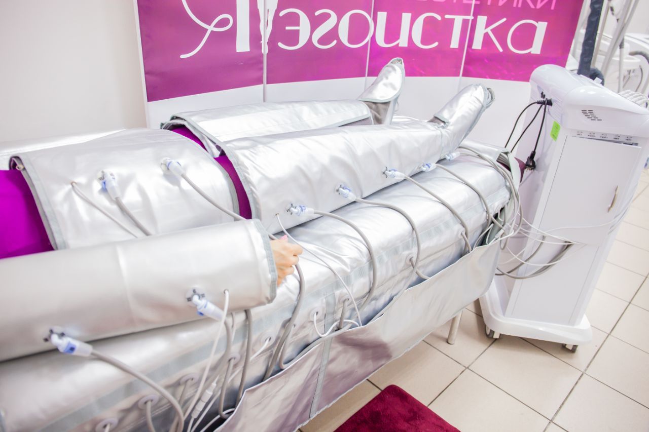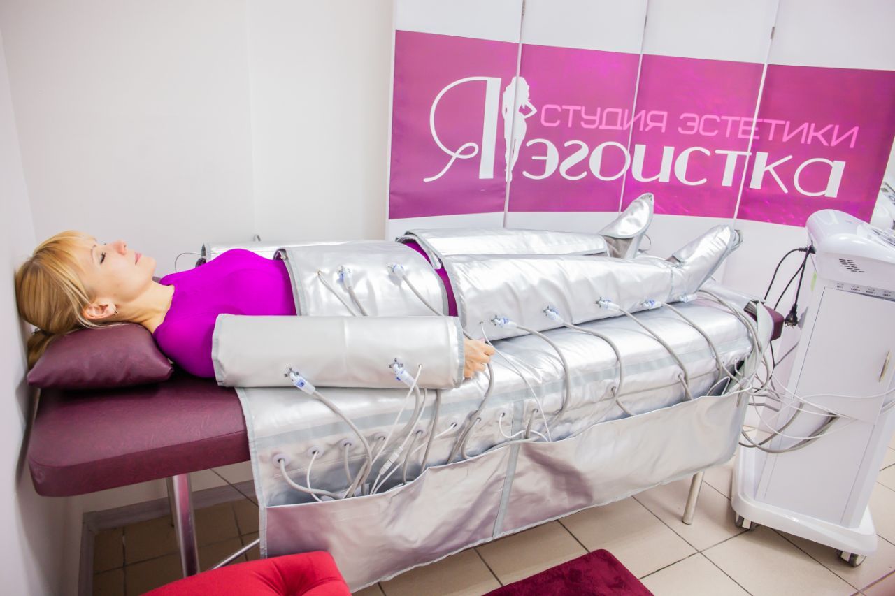Прессотерапия - это массаж, при котором применяется сжатый воздух. Он подается от косметологического оборудования в специальный костюм (манжеты). Возможно воздействие как на все тело, так и на отдельные части: руки, ноги, поясницу, живот. Аппарат имеет специальное программное обеспечение для регулирования интенсивности и времени давления. Клиент не ощущает во время процедуры дискомфорта или боли, напротив, по телу разливается тепло, мышцы расслабляются.